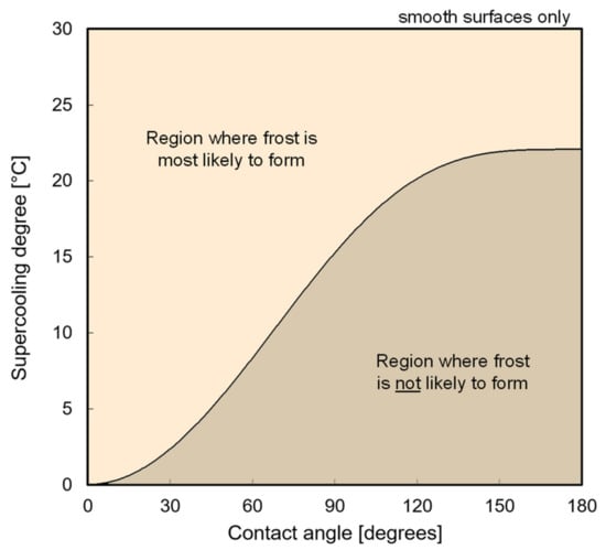 Becker and Doring [9] proposed that the minimum energy barrier holds an exponential relationship with the so-called embryo formation rate for heterogeneous nucleation, I, which is a probability function, so that ∆Gmin ≈ −k Te ln(I/I0), where I0 = 1025 embryo/cm2s is a kinetic constant of desublimation, and k = 1.381 × 10−23 J K−1 is the Boltzmann constant [10]. With I = 2.2 embryo/cm2s, observed experimentally by Volmer and Flood [11] as the critical embryo formation rate for homogeneous nucleation, the Becker–Doring theory can be used together with Equation (1) to come out with the threshold for the onset of nucleation expressed in terms of the supercooling degree as a function of the contact angle, as illustrated in Figure 6. Due to the stochastic nature of the process, reflected in the Becker–Doring formulation, the curve in Figure 6 divides the domain into two regions, with the upper one indicating the conditions when frost is most likely to occur and the lower region indicating the opposite. Moreover, one can notice in Figure 6 that the energy barrier for frosting on super-hydrophilic surfaces (θ⟶0°) is quite low, requiring virtually no supercooling for the onset of nucleation. On the other hand, the highest supercooling is observed for superhydrophobic surfaces (θ⟶180°), although a plateau around ∆Tsup ≈ 22 K is observed for θ > 135° [12]. This high initial energy barrier can lead to a delay in the onset of frosting on superhydrophobic surfaces by as much as one hour [13,14,15]. In practical terms, this barrier to frosting is even more attenuated in the case of non-smooth surfaces typical of refrigeration applications, as the surface roughness is likely to favor the onset of nucleation due to the reduction on the interface area, i.e., less energy required to form a new interface [8,16].