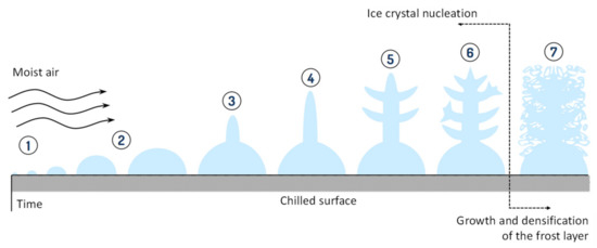 The frost formation over a flat surface can be divided into several steps [17], as schematized in Figure 7. After the nucleation (1), the embryo starts growing (2). During this stage, the surface wettability can influence the size and shape of the growing embryo. Its surface area and temperature increase as it grows, requiring a higher amount of energy withdrawal to keep growing. When such amount becomes higher than the amount required for new nucleation, the primary embryo stops growing, and a secondary one emerges at a new site on the surface of the original embryo (3). Once again, the new embryo grows (4) so that successive embryo nucleation and crystal growth cycles (5, 6) go on until a mature layer of frost is formed (7). Stages (3) to (6) are called the early crystal growth period and are characterized by the morphology of the ice crystals.