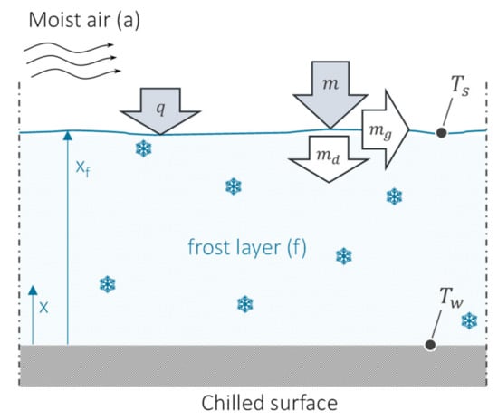 where the first term of the right-hand side stands for the frost growth rate, whereas the second term is responsible for the densification as water vapor diffuses inside the frost layer, changing phase into ice crystals within the porous medium, thereby reducing the frost layer porosity, ε = (ρf − ρi)/(ρa − ρi). In general, Equation (3) can be easily integrated using an explicit, forward Euler approach to come out with the time evolution of the frost thickness, xf.