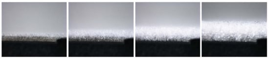 Snapshots of the frost formation process as a function of time for an airstream velocity of 0.7 m/s, air temperature of 16 °C, relative humidity of 50%, and a plate temperature of −18 °C [8].