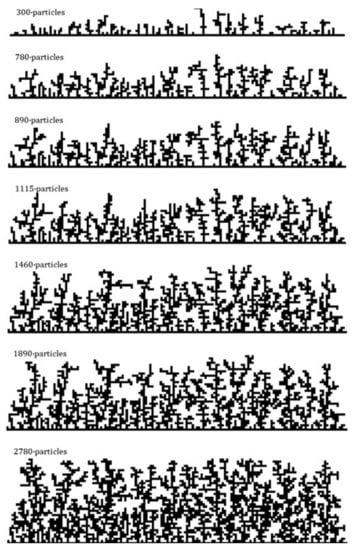 where the coefficients of Equation (6) were fitted to the experimental data according to the frost morphology: needles and sheaths (−10 < Tw < −4 °C, a = 1.576, b = 0.797), plates and dendrites (−19 < Tw < −10 °C, a = 1.594, b = 0.761), and sheaths (−30 < Tw < −19 °C, a = 1.035, b = 0.797). Equation (6) is valid for wall surface temperatures ranging from −30 to −4 °C, and frost porosities spanning from ε = 0.50 to 0.95. In a follow-up study, Negrelli et al. [58] advanced a simulation model for predicting the thermal conductivity of frost for various operational conditions and, therefore, distinct frost morphologies. The frost growth was modeled using fractal theory, particularly the diffusion-limited aggregation approach, which forms heterogeneous porous media that emulate the morphology of the frost layer, as depicted in Figure 11. A comparison between the different images in Figure 11 shows that the model can simultaneously reproduce both the growth and densification of the frost layer. The effective thermal conductivity of frost was calculated from an inverse solution of the heat diffusion problem using a finite-volume method, agreeing with the experimental data from [59] to within ±15%. More recently, Hosseini et al. [60] adopted a genetic programming approach to put forward semi-empirical correlations for the thermal conductivity based on dimensionless parameters such as the frost porosity and the Reynolds, modified Jakob and Fourier numbers.