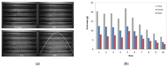 Figure 12 shows a sequence of snapshots taken at different time steps using a purpose-built testing facility that allows the determination of the instantaneous pressure drop and cooling capacity, and a visual inspection of the frost distribution over a 10-row coil [102]. One can see in Figure 12a that the frost is most likely to accumulate on the central part of the evaporator, according to a parabolic pattern, which is due to the air return from the fresh food located in the central part, while the slots returning air from the frozen-food compartment are located on the sides. Interestingly, it was also observed that the frost mass at the fifth row is as high as that of the first row, as depicted in Figure 12b. In this case, the lower humidity gradient downstream of the coil is compensated by its higher fin density, which leads to a larger surface area for frost formation. This sort of frost mapping obtained either by visual inspection or simulation models, can provide key insights into optimally distributing the electric defrost heater power over the evaporator surface.