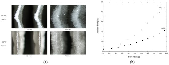 Alternatively, Da Silva et al. [103] proposed a first principles simulation model to predict the thermal-hydraulic performance of light commercial-type fin-and-tube evaporators under frosting conditions accounting for the non-linear effect induced by the combination of frost growth and the fan supplied air flow rate. They confirmed that progressive flow blockage caused by frost thickness rules the cooling capacity degradation process compared to the reduction in the effective thermal conductivity caused by the frost layer. In a follow-up work [108], the effects of the frost morphology on the thermal-hydraulic performance of fan-supplied evaporators were also assessed. Figure 13a depicts a visual comparison of the frost morphologies obtained with distinct evaporator surface temperatures. Regarding the morphological aspect of the frost medium, it should be noted that needle-shaped structures were observed when the evaporator was kept at −10 °C, whereas granular and compact ice crystals were found for −3 °C. Although subtle, these distinct structural characteristics of the frost layer have a strong impact on the performance of the evaporator. For instance, Figure 13b shows that the same amount of frost causes different air flow obstructions revealed by pressure drop measurements across the evaporator. As can be seen, a pronounced airside pressure drops were always observed when the evaporator temperature was −10 °C as compared to −5 °C, which is largely due to the lower frost density related to the former.