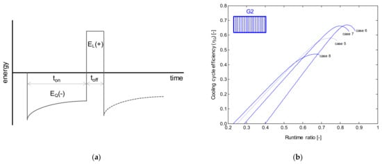 Representation of the cooling and defrost cycles (a), and the so-called cooling cycle efficiency as a function of the compressor runtime ratio (b) [4].