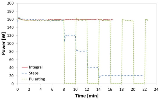 Later, Melo et al. [123] investigated the performance of defrost systems applied to household refrigerators using a purpose-built testing apparatus comprised of a calorimeter, a refrigerated cabinet, and a humidifying system. This approach allowed for an experimental comparison between different defrost systems, maintaining strict control of operating conditions. They evaluated three distinct types of electrical heaters (distributed, calrod, and glass tube) and three actuation modes (integral power, power steps, and pulsating power, as shown in Figure 15) at the same frosting conditions over the evaporator. Table 3 shows the defrost efficiencies related to each defrost system configuration. As can be seen, similar defrost efficiencies were observed for all technologies assessed at the same operating modes, over a range between 27.5% and 48%. Despite the highest efficiency reached by the glass tube at step power mode (48%), Melo et al. [123] stated that the calrod heater seemed to be the most appropriate technology for general use due to its efficiency, low cost, and easy installation.