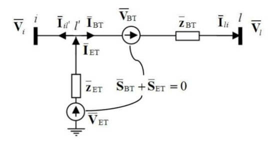 During consideration to be presented in the paper, the quadrature booster is represented by the model shown in Figure 3. The model consists of two controllable voltage sources. Their internal impedances and represent impedances of transformers ET and BT, respectively.