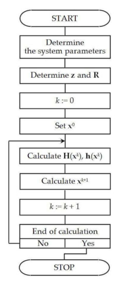 An algorithm for Method 1 assumes realization of the same steps as for the classical state estimation (see Figure 4). Vector h(x) and matrix H(x) that are used in the algorithm are different from those considered in the classical state estimation.
