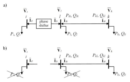 Unlike in Method 1, in Method 2 of the state estimation, the quadrature booster is switched off in the used power system model. This is illustrated in Figure 5. Figure 5 presents the branch between nodes i and k, in which in the real power system there is the phase shifter (the quadrature booster). Figure 5 shows two cases considered in the paper. The case in Figure 5a is taken into account in Method 1, and the case in Figure 5b—in Method 2.