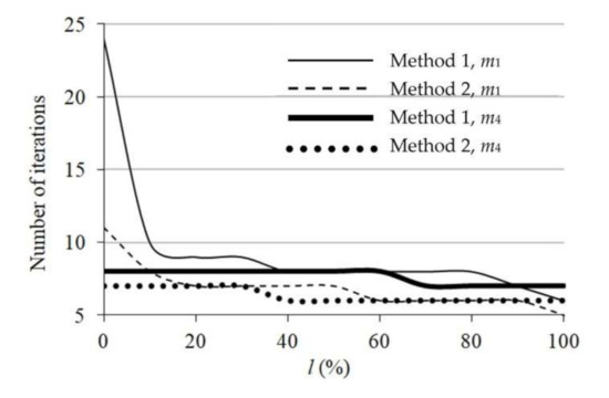 Summing up, it can be stated that in Method 1 more accurate results (closer to the actual values of the considered quantities) than in Method 2 are obtained. At the same time, in Method 1 there are more iterations and the conditioning of the computational process deteriorates in comparison to Method 2.