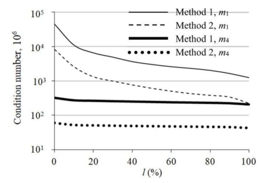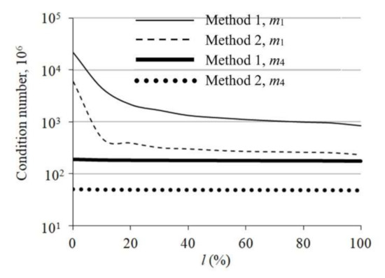 When condition number cond(G) is taken into account, the situation, is very similar to one which is described earlier. Compared to Method 2, in Method 1 apart from mean values, the minimum and maximum values and standard deviations are greater for all considered numbers of measurement data and all considered load levels. The coefficient of variation is smaller for Method 1 than for Method 2 for: (i) all numbers of measurement data when the load level is equal to V0.5 and (ii) the number of measurement data is equal to m2 and m3 when the load level is equal to V1.5.