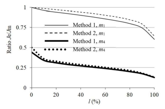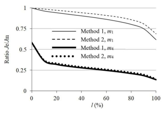 The relations between the parameters (minimum, maximum, mean values, and standard deviation) of the ratio Je/Jm for Method 1 and for Method 2 are different than for the previously analyzed indices. Most of the parameters of ratio Je/Jm are significantly smaller for Method 1 than for Method 2. Even if some parameter of the ratio Je/Jm is greater for Method 1 than for Method 2, the difference in the values of the parameter under consideration for Method 1 and Method 2 is relatively small. The coefficient of variation is greater for Method 1 than for Method 2 for (i) all numbers of measurement data except m4 when the load level is equal to V0.5 and (ii) all numbers of measurement data when the load level is equal to V1.5.