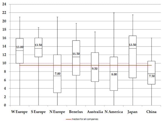 Four regional groups achieved a higher median of overall rating than the entire population: Western Europe, Southern Europe, Benelux and Japan. The lowest median, but also the first quartile results, were recorded for Northern Europe. All regions had entities with an overall zero rating. The companies with the highest overall rating represented the North American group. As there is no single group with the highest values of extremes, median, first and third quartile at the same time, there is no clear leader among the regions. It is also impossible to unequivocally identify the region with the worst results.