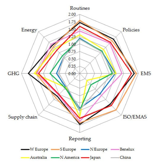 The data in the table confirm the previous assumption about the high- and low-scoring groups of regions. It is important to point out that Benelux is the highest scoring region in two indicators concerning actual environmental performance: GHG emissions and energy consumption. Companies representing all regions struggle with creating and implementing environmental requirements in the supply chain. It signals the global problem of turning into a broader perspective of CSR—from individual into supply chain activities. The biggest dispersion among regions were observed in ISO 14001/EMAS certification.