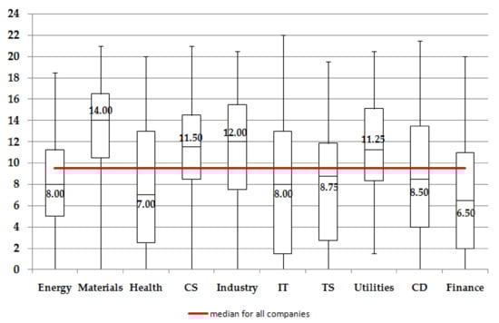Four sectors achieved a higher median of overall rating than the entire population: materials, utilities, industry and consumer staples. Moreover, the first two mentioned sectors obtained values of the first quartile higher than the median for the whole population. The two leading sectors are easy to identify in the figure even without numeric data (Figure 3).