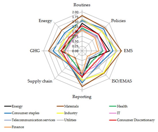 - In the sector analysis, high- and low-scoring groups also exist, but there are no links between them. Instead, there were sectors which stuck out positively and negatively from others. Sectors with the best environmental practices are utilities, industry, consumer staples and materials as a leader of that group. Materials are significantly better than all other sectors except utilities. Consumer discretionary, telecommunication services, IT, energy, health care and finance sectors create a low-scoring group. The financial sector obtained significantly lower results than consumer discretionary;