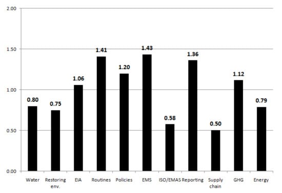 As it was in the case of geographical analysis, the lowest partial grades were obtained in the case of environmental requirements inside the supply chain (Table 8). The highest grades were obtained for environmental management systems.