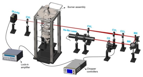 The light extinction setup (see Figure 1) was employed to obtain quantitative soot volume fractions (SVF) [,,]. A He-Ne laser with a wavelength of 632.8 nm was used as the light source. The emitted laser, after passing a mechanical chopper and being rerouted by two silver mirrors, was enlarged by a Galilean beam expander (consisting of two convex lens and one concave lens). The aim of using a Galilean beam expander was to minimize the focal diameter of the laser beam (through reducing the beam divergence angle) and, therefore, improve the spatial resolution of the soot measurements. The transmitted laser then passed through a refocusing convex lens and an integrating sphere (to minimize the beam steering effects); after which, it was detected by the photodiode detector. The mechanical chopper and the lock-in amplifier provided an enhanced signal-to-noise ratio.