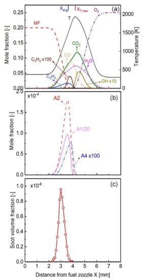 Computed flame structure of the (a) temperature profile, concentration of the intermediate species, and (b) aromatics species, as well as (c) the measured SVF profile for MF counterflow flames (XF = 0.2 and XO = 0.25).