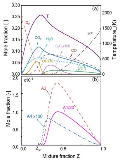 Computed flame structure of the (a) temperature profile, concentration of major species, and (b) PAHs in the mixture fraction space.