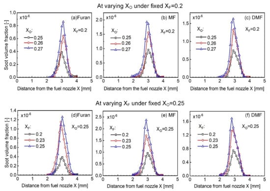 Figure 4 shows the measured axial profiles of SVF in furan, MF, and DMF flames under different oxygen concentrations and fuel stream conditions. For all the flames, a general consensus can be reached that, at a fixed XO, the maximum soot volume fraction increases monotonically with the increasing XF, which is easy to understand due to the increased fuel content and soot precursors formation. On the other hand, at a fixed XF, the soot volume fractions will also increase monotonically with the increasing XO. This increasing trend of SVF with XO in the present SF flames is consistent with a previous works []; the reasoning was generally attributed to an increased flame temperature at a higher XO, which, in turn, enhance fuel pyrolysis and the formation of soot precursors. The measured SVF profiles in Figure 4 are expected to serve as a reliable dataset for model validation and refinement.
