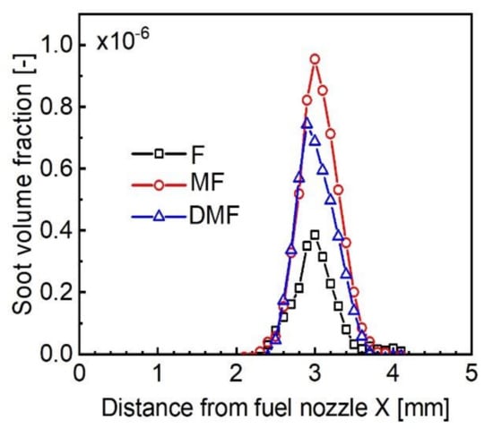 Profiles of the soot volume fraction for furan, MF, and DMF performed at the conditions of XF = 0.2 and XO = 0.25.