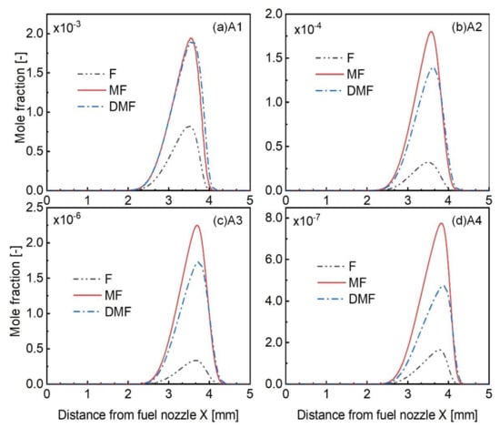 Computed mole fractions of A1-A4 for furan, MF, and DMF flames.