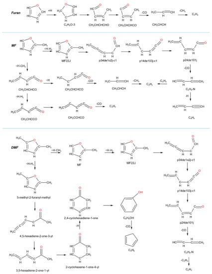 Major fuel decomposition pathways and the formed decomposed products for furan, MF, and DMF.