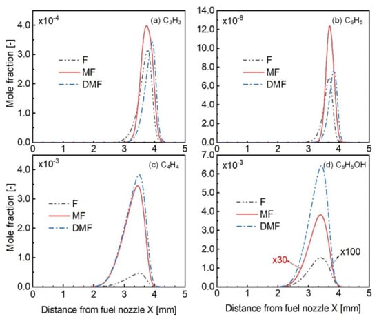 Supporting the reaction pathway analyses, the concentration of several important intermediate products during the decomposition of furan, MF, and DMF are shown in Figure 8. As can be seen, furan flame has the least amount of (a) C3H3, (b) C6H5, (c) C4H4, and (d) C6H5OH concentrations. As will be detailed later, these species are important precursors of benzene formation and PAH growth. This can be the reason for the lower soot production in furan flame compared to MF and DMF flames. When comparing MF and DMF, it shows that MF has more C3H3 and C6H5 while DMF flame has higher amounts of C4H4 and C6H5OH, due to the different fuel composition pathways. Such differences will eventually lead to different soot productions in MF and DMF flames.