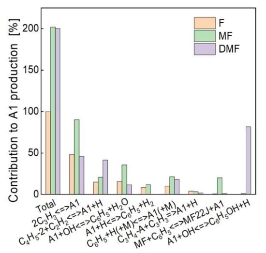 Percentage contribution to the A1 production from each reaction for furan, MF, and DMF flames (XF = 0.2 and XO = 0.25). Here, MF22J is 2-furanylmethyl.