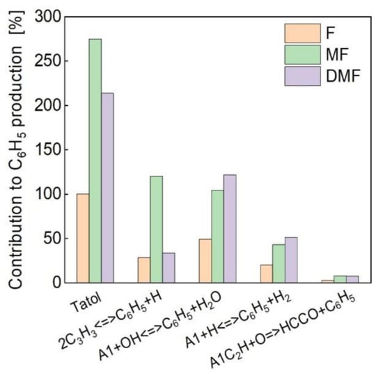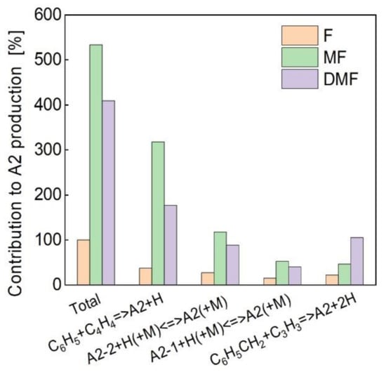 Figure 10 shows the dominating reaction channels of the A2 formations, as well as their respective contributions to the total A2 production. It shows that the dominant A2 formation reactions are similar among the tested furan, MF, and DMF flames; they are the reaction of H with aryl radicals (A2-1 and A2-2) produced from A1 via the sequential H-abstraction and C2H2 adding reaction, i.e., the well-known HACA scheme [,]. In addition, the combination of C6H5 with C4H4 and the com-bination of benzyl (C6H5CH2) and C3H3 radicals also play a role in A2 production. However, the rate of these A2 production reactions vary significantly in furan, MF, and DMF flames. As expected, furan flame has the smallest total A2 reaction rate and the individual formation rate compared to DMF and MF flames, due to its much lower concentration of A2 precursors such as A1, C6H5, and C4H4.