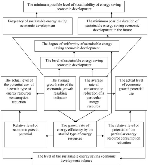 As follows from Expressions (14)–(16), the maximum value of Expression (16) is one. At the same time, the closer the value of this indicator approaches one, the more balanced is the energy-saving economic development. Based on the formulas for the evaluation of various properties of sustainable energy-saving economic development, it is possible to establish the relationships between these properties, which are shown in Figure 1. In particular, it can be seen that such a property as sustainability is a derivative of two other properties. They are the frequency and expected duration of the sustainable energy-saving economic development in the future. Regarding the level of sustainable energy-saving economic development, it depends on two characteristics of such development—the average growth rate of the resulting indicator of economic growth and the average rate of decline in consumption of a particular energy resource. These two characteristics determine the minimum possible duration of sustainable energy-saving economic development in the future. In turn, the level of sustainable energy-saving economic development, along with the rate of growth of energy efficiency by the studied type of energy resource, determines the degree of uniformity of sustainable energy-saving economic development. The balance of this property of sustainable energy-saving economic development should be noted. At the same time, its value is determined by the actual level of use of the potential to reduce the consumption of a certain type of energy resource and the actual level of use of the potential for economic growth.