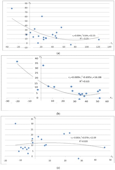 Scatter diagrams and graphs of quadratic regression equations, which characterize the relationship between the growth rate of natural gas use efficiency (r1, %) and GDP growth rate according (r2, %) to the countries: (a) in 2018 compared to 2010; (b) in 2014 compared to 2010; (c) in 2018 compared to 2014.