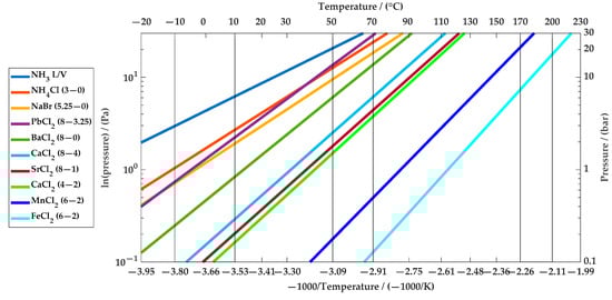 Based on the equilibrium lines in Figure 2, ammonium chloride (NH4Cl), sodium bromide (NaBr), lead chloride (PbCl2) and barium chloride (BaCl2) can be considered as candidates for the LTS. However, NH4Cl is the only candidate salt, for the −10 to 10 °C low temperature heat input, that operates at working pressures on or above atmospheric pressure. To ensure a suitable power density and overall performance from the ammonia-salt reactions, working at, or above, atmospheric pressure is highly valuable when considering mass transfer for the completion of the sorption reaction [20,21,22,23].