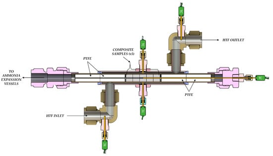 The prepared composite samples, see Section 2.1, were placed in the reactor and connected to the experimental rig. The complete experimental setup is shown in Figure 4 and a schematic diagram of the rig is detailed in Appendix B, Figure A1.