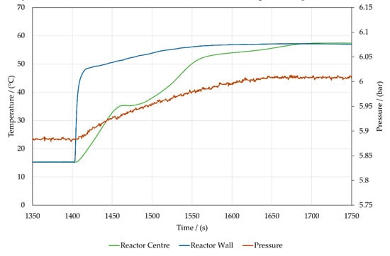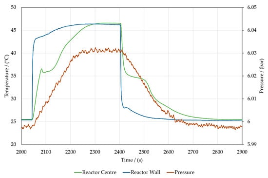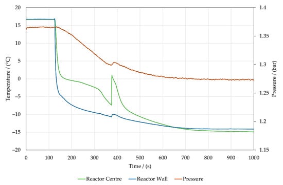 The rig and reactor were evacuated, the reactor isolated and the rig expansion vessels filled with ammonia. A separate air-cooled temperature-controlled circulator bath (Ministat 240, Huber, Offenburg, Germany) using water as the heat transfer fluid was used to regulate the temperature of the expansion vessels through the hose wrapping seen in Figure 4. Once stable temperature and pressure conditions were reached, the reactor and the composite samples were exposed to ammonia by opening the reactor to the expansion vessels. A series of LTJ tests were conducted using the published equilibrium data for NH4Cl from An et al. [3] as a guide to observe the phase change at different pressures in the range 0.5–8 bar.