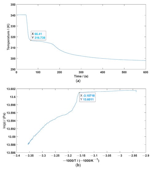 An example of the two MATLAB® plot outputs with a linked datatip readout for an adsorption reaction at approximately 8 bar with a temperature jump of 70 °C to 25 °C. (a) Plot of the composite sample temperature (K) against time (s) with the start of the isothermal phase change highlighted—in this case at 66.4 s and 316.7 K. (b) Plot of ln(p) (Pa) versus −1000/T (1000/K) with the onset of adsorption visibly clear with a sharp change in ln(p) value indicating the onset.