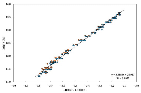 To determine individual salt equilibrium pressures and temperatures, an adsorption or desorption reaction dataset is analysed in MATLAB® and two plots are generated, as illustrated for one such p-T pair in Figure 6. The first, Figure 6a, is the centre temperature profile (K) plotted against time (s) and the second, Figure 6b, is a plot of ln(p) (Pa) versus −1000/T (1000/K). A linked data cursor is programmed between the two plots to determine the onset of adsorption or desorption—by recording the onset temperature and pressure noted by the data cursor. For each experimental dataset (an adsorption or desorption reaction), an equilibrium ‘point’ is recorded and from which a scatter graph is generated, and a linear regression fitted to the data to obtain the working equilibrium lines.