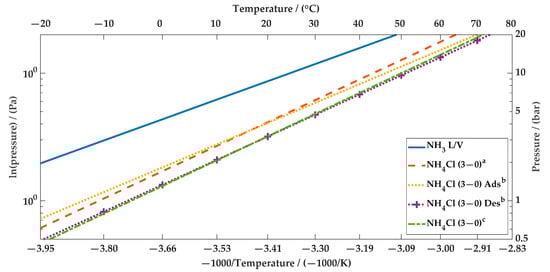 Plot of Pressure (0.5 to 20 bar) vs. −1000/Temperature showing the ammonia liquid/vapour line, a single reported line from An et al. [3] a, Oliveira et al. [34] adsorption and desorption lines b and this work from Figure 7 c.