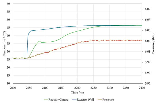 Example LTJ desorption output for a 25 to 45 °C temperature jump, using a ‘half’ concentrated composite sample set, exhibiting a linear pressure rise with the reaction indicating heat transfer limitations.