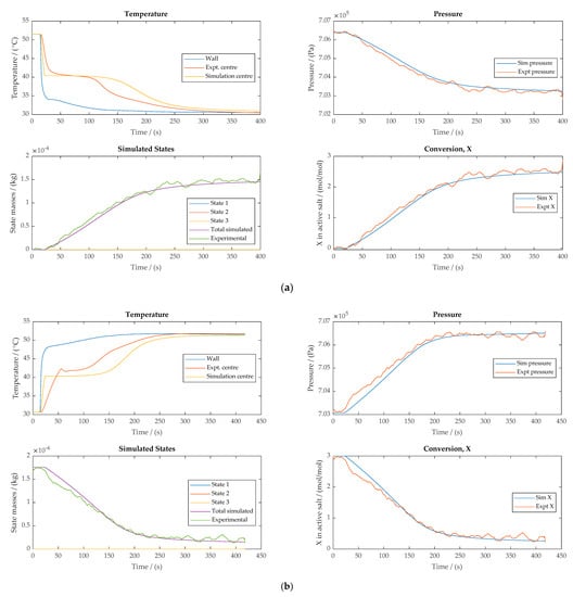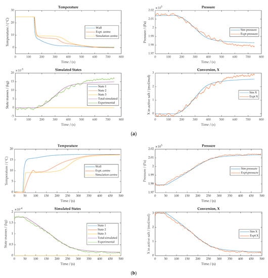 Through iterative trial and error, the adsorption and desorption kinetic reaction constants, Equations (2) and (3), were determined. Once the conductivity of the ENG [25] and the heat transfer resistance (gap—obtained by finding the optimum balance of matching the initial centre temperature profile change and the rate of pressure change) were set, the remaining constants were found through observing the impact of changing each constant on the simulated response, noting the change, noticing the interaction between the constants and repeating for each constant. Regarding visible changes to the model output, the active fraction, which is the amount of salt available to the reaction, most obviously affects the duration of the isothermal phase change and the pressure rise; the constant A, which is an assumed constant Arrhenius term [28], affects the gradient of the slope at the end of the reaction, after the isothermal phase change, where the composite samples heat (or cool) to the wall driving temperature; the power constant n, which represents an approximation to the order of the reaction, impacts how long the reaction takes to complete adsorption or desorption, affecting the shape of the temperature and pressure profiles following the isothermal phase change.