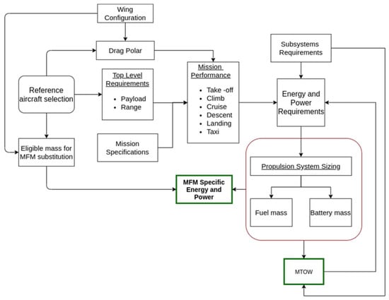 Aircraft sizing flow diagram (MTOW = maximum take-off weight, MFM = multifunctional material).