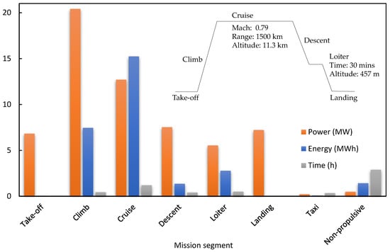 A numerical model was formulated to calculate the maximum power requirement and total energy based on the take-off weight (TOW) and mission profile of an A320 using a Matlab script to compute the flight mechanics analysis detailed in Section 2.2. This model was applied to a conventional A320 design and validated against existing studies, as follows. The take-off weight of the baseline A320 included the OEW, payload and fuel. The fuel requirement to complete the design mission profile was approximated from empirical weight fractions for a civil jet. The fuel consumption during cruising and loitering was estimated for the lift-to-drag ratio, L/D, and specific fuel consumption, C, of A320 wings and engines, using the Breguet range equation [42], R = (V/C) (L/D) ln(Wi/Wf), where R is the range, V is the velocity, Wi is the initial aircraft weight and Wf is the final aircraft weight after the mission segment has been completed. The final fuel weight included a 5% contingency fuel, as per ICAO regulations, resulting in a total of 5.7 t for a 1500 km mission. The TOW for the design mission was then approximately 65 t. For the estimated take-off weight and range, the energy and power demands are presented in Figure 7.