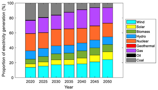 The future electrical grid was modelled using the European Commission (EC) reference scenario for the energy grids of the European Union members [64] and how the electricity generation split is projected to evolve up to 2050 (Figure 8). The increase of the renewable energy sector and the reduction of coal electricity generation is expected to reduce the carbon intensity per unit electrical energy from the grid significantly.