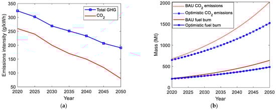 (a) Emissions intensity from the EU grid compiled using data from [15,64]. (b) Aviation emissions and fuel burn projections compiled using data from [2] (BAU = business as usual).