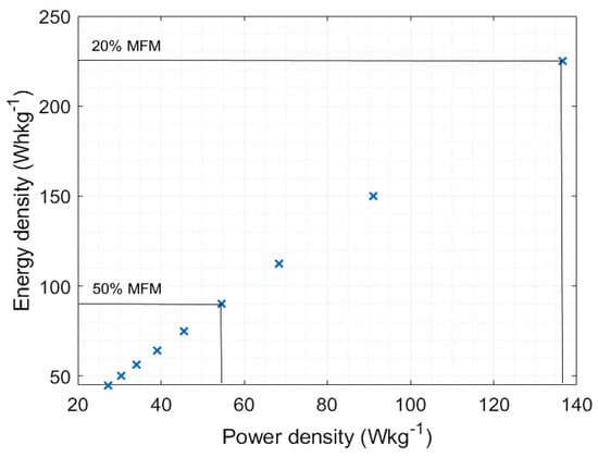 Gravimetric energy and power density requirements for an MEA SPC airframe. The marks show the percentages of the airframe mass replaced by multifunctional material (MFM) in increments of 10%.