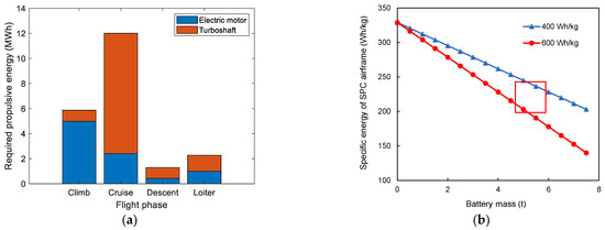 (a) HEA propulsive energy split. (b) SPC performance requirements for HEA with an SPC airframe together with 400 Wh/kg and 600 Wh/kg batteries.