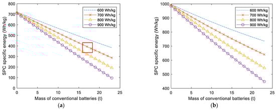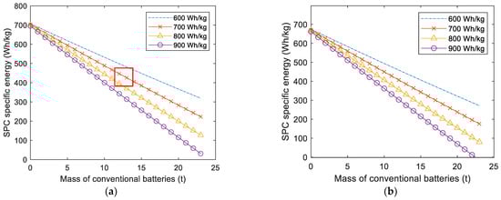 The required E* of a fully SPC airframe for different levels of HTS cruise power setting (Table 9) is close to that of current Li-ion batteries. The required performance for the SPC airframe can be lowered if the HTS motors operate at lower power settings during cruising. Even if the HTS motors are switched off during cruising, the fuel saving with an SPC airframe would be over double that of the 7% fuel efficiency improvements for other A320 HEA designs in the literature [70,71]. Alternatively, batteries could be added. Figure 11b shows how the SPC E* requirements vary for future batteries for a 1500 km mission. Even with an additional 7.5 t of battery mass, the HEA design would have 17% better fuel efficiency than the conventional A320. However, unless the batteries’ E* is much higher than 400 Wh/kg, adding batteries would not significantly lower the performance targets for the SPC airframe, whilst introducing issues with their onboard accommodation, thermal management and safety. A potential design zone to target for 1500 km HEA might be that shown in the red box in Figure 11b—for example, a 200 Wh/kg SPC airframe with 5 t of 600 Wh/kg batteries. The SPC E* target, which matches the performance of existing Li-ion batteries, could be considered a plausible stretch target, given that a 131 Wh/kg [72] (260 Wh/L, 12.1 N m2 bending rigidity, 9.6 GPa elastic modulus [73]) structural battery has been experimentally demonstrated and a 160 Wh/kg (330 Wh/L) structural battery has been calculated to be producible by tripling the stack thickness. The battery targets may be achievable using known, but not yet widely implemented, chemistries, such as Li-S [74,75] or Zn-air, with which 523 Wh/kg [76] has been experimentally demonstrated and over 700 Wh/kg has been projected [77].