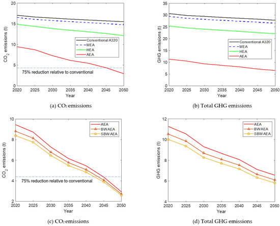 The CO2 emissions from the aviation sector as projected by ICAO [2] are shown in Figure 9b. Under a business-as-usual scenario, with only moderate advancements in fuel efficiency, emissions are expected to triple by 2050, whereas more optimistic assumptions suggest emissions are significantly lower. Both scenarios emphasize the need for more disruptive design innovations if green aviation targets are to be met. ICAO estimates that 3.16 kg of CO2 is emitted for every kg of jet fuel burned [2]. The greenhouse impact of non-CO2 aviation emissions is difficult to predict, and there is uncertainty in how to measure this impact. The emissions per flight for the conventional A320 were calculated by assuming that 2.58 kg of non-CO2 GHGs are emitted for every 1 kg of jet fuel burned [15]. Electricity transmission efficiency and battery charging efficiency were accounted for in the calculations.