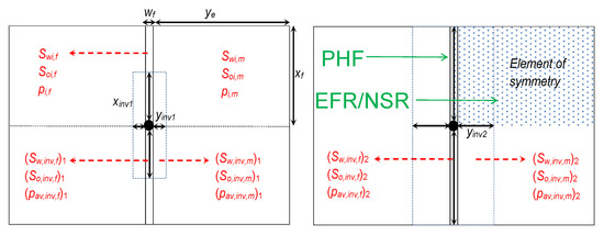 Water and oil flux from the matrix to primary hydraulic fracture, included in Equations (3)–(6), are evaluated using the following flow equations: