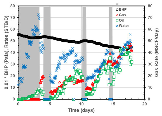 Field data gathered during the flowback period of the studied MFHW. The gray zones highlight inconsistencies in the data. No gas production is reported for the first zone. In the second through fourth zones, trends in BHP are not consistent with production or lack of production.